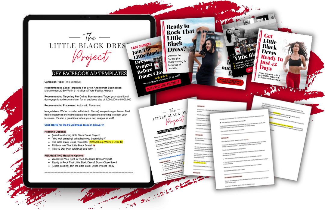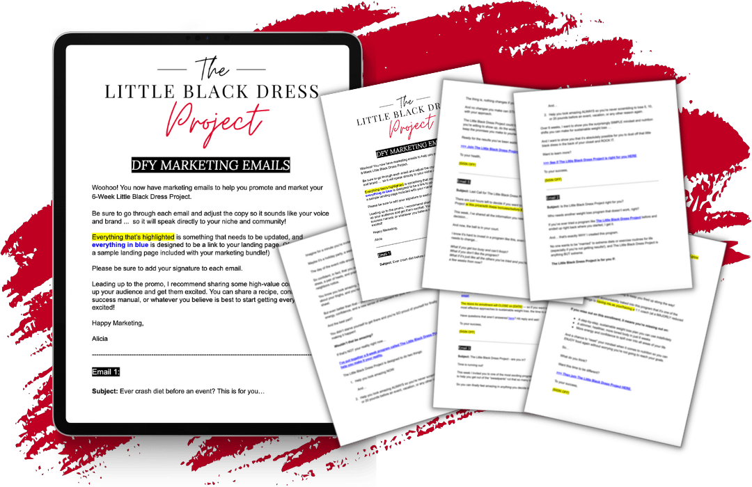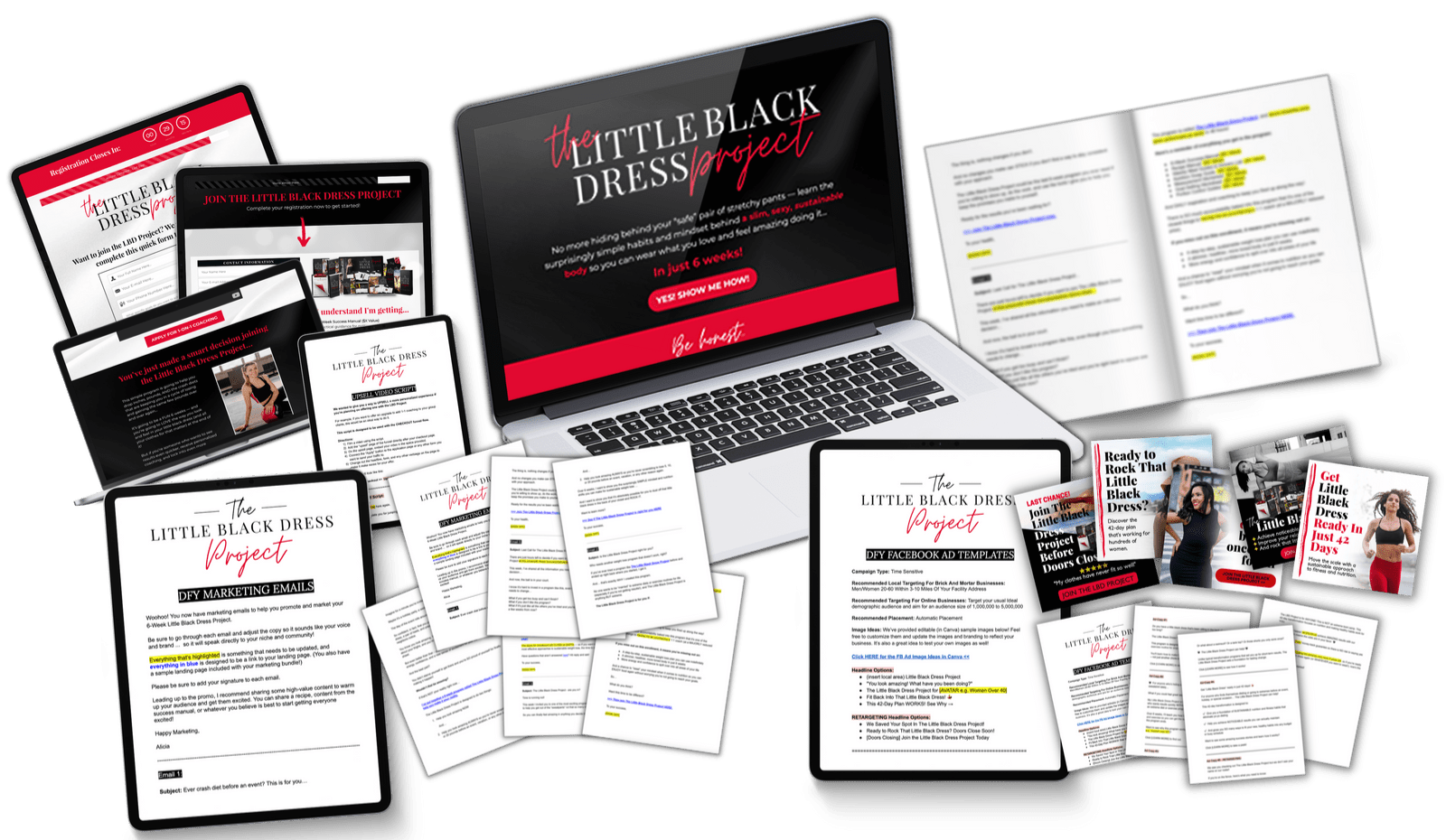 This complete marketing bundle is specifically designed to pair with our signature DFY transformation challenge, The Little Black Dress Project!